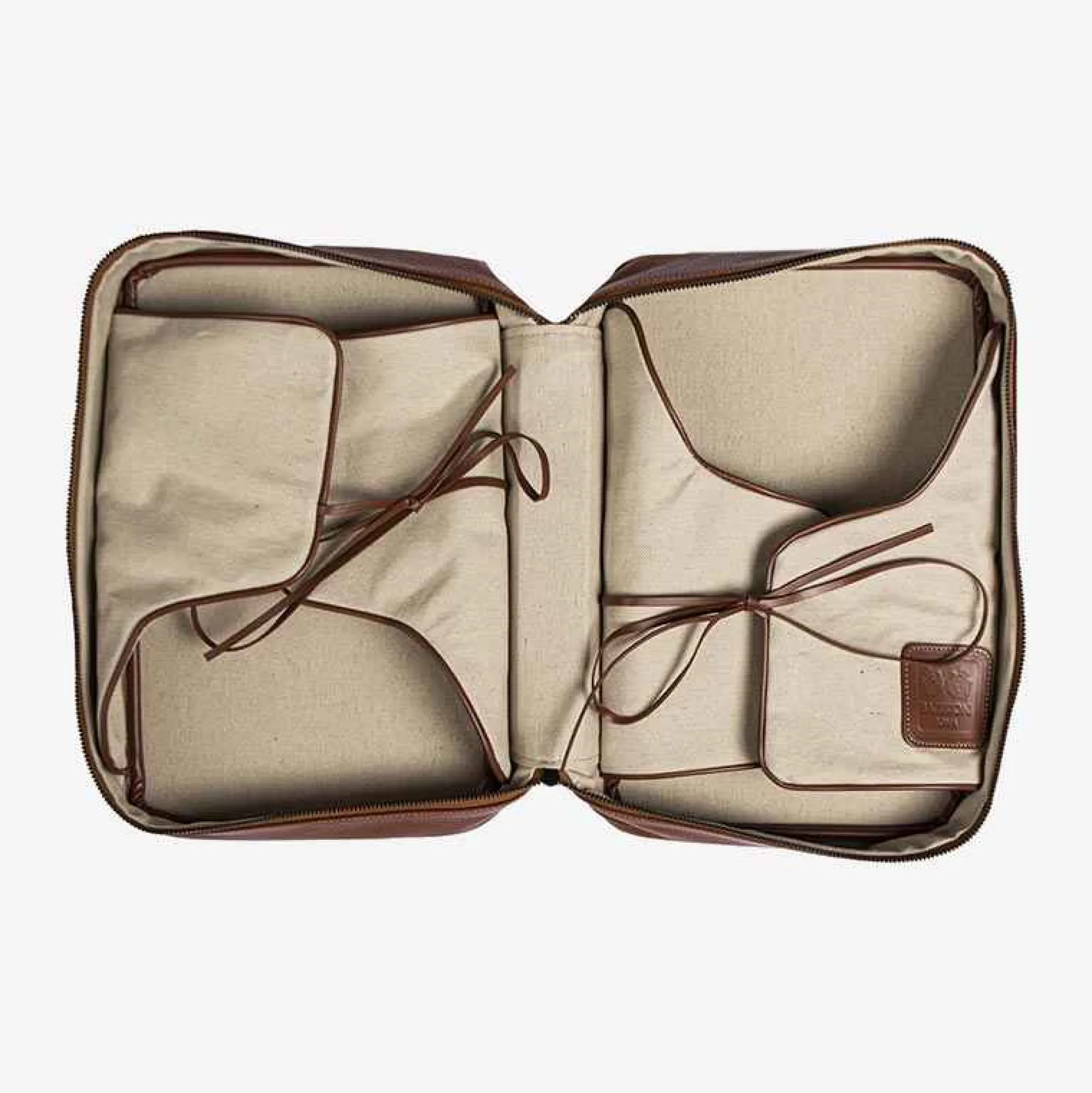 Battistoni Canvas Shirt Bag With Inserts In Tan Embossed Leather. Perfect To Accomodate Everything You Need For A Business Trip Or A Week-End Gateway. Be Impeccable Even On The Go With The Smartest Option For Short Business Trips.