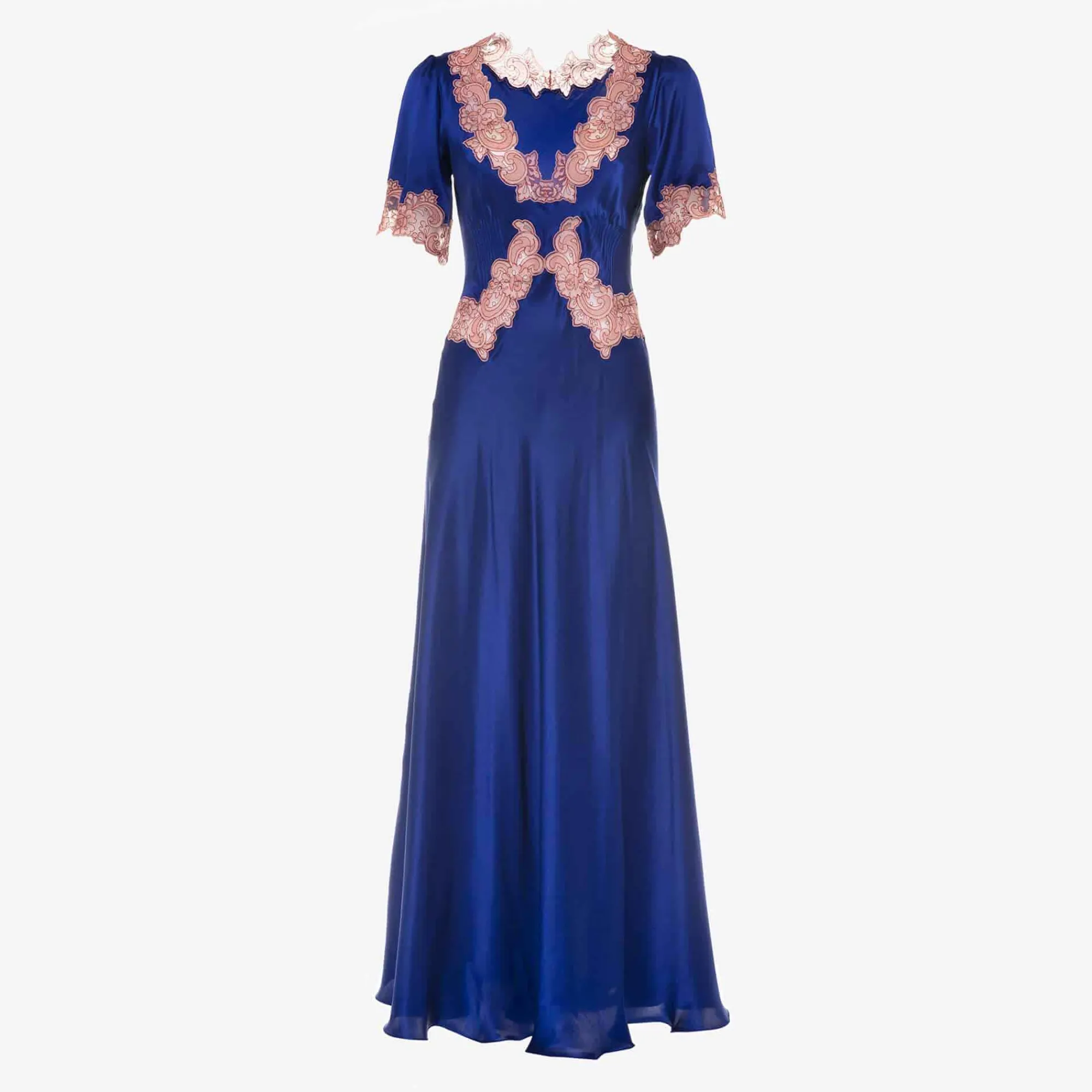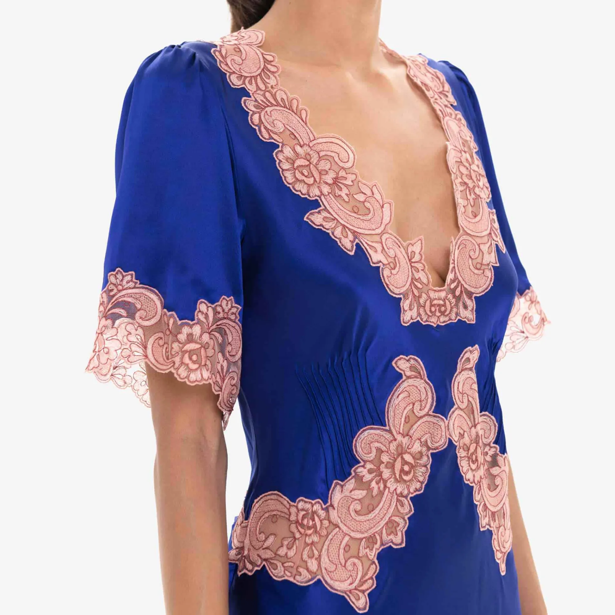 Issimo X Loretta Caponi’S V Neck Full Length Dress In Pure Blue Silk Satin, Decorated With Cotton Blend Lace In Aubergine Color And Short Sleeves Was Inspired By Ml’S Childhood Friends And The Colors Of Rome.