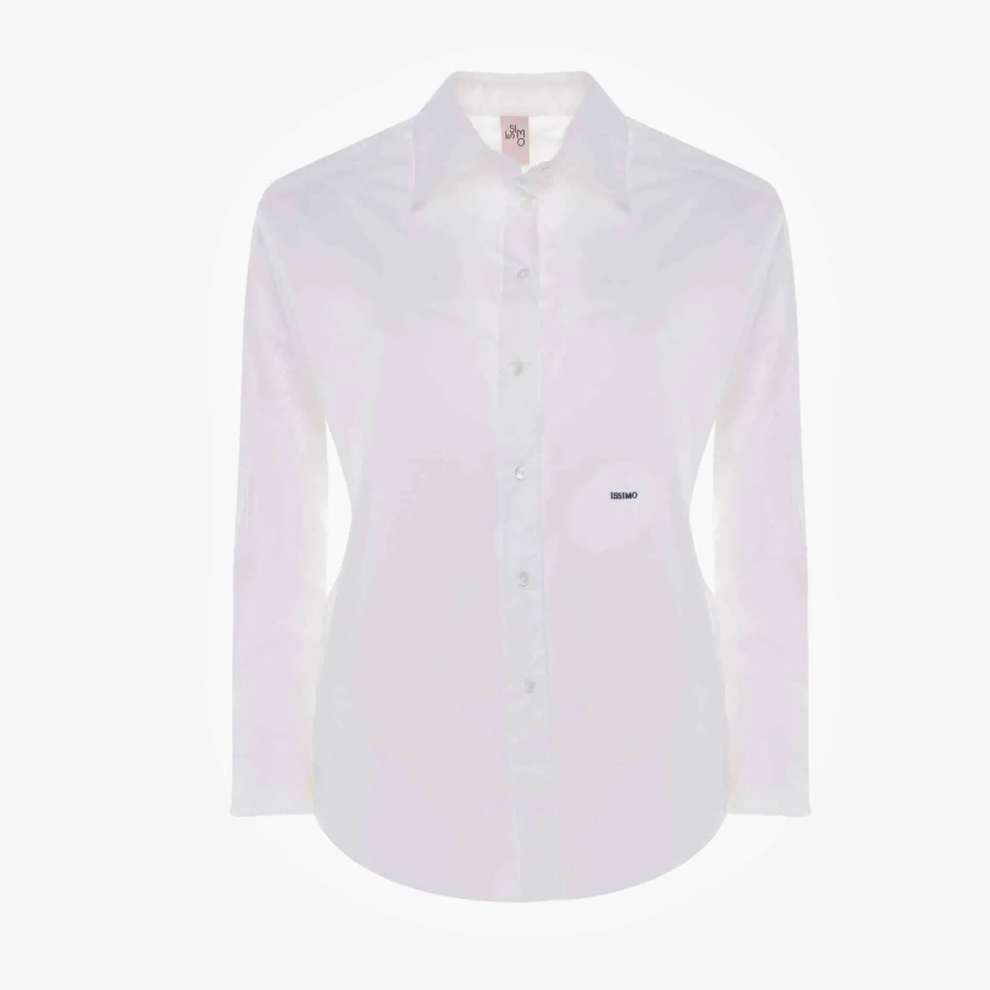 White Loose Shirt With Drooping Shoulder, Featuring An Exclusive Issimo Embroidery On The Side. This Is The Perfect Everyday White Shirt To Be Paired With Any Look To Give It An Issimo Touch!