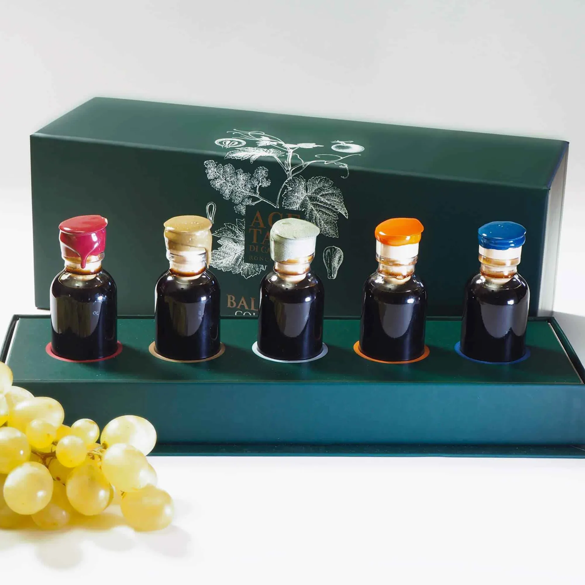 Selection Of 5 Precious Balsamic Condiments By Acetaia Di Canossa, Aged 18, 12, 20, 25 And 40 Years In Wooden Barrels. 100% Cooked Grape Must.