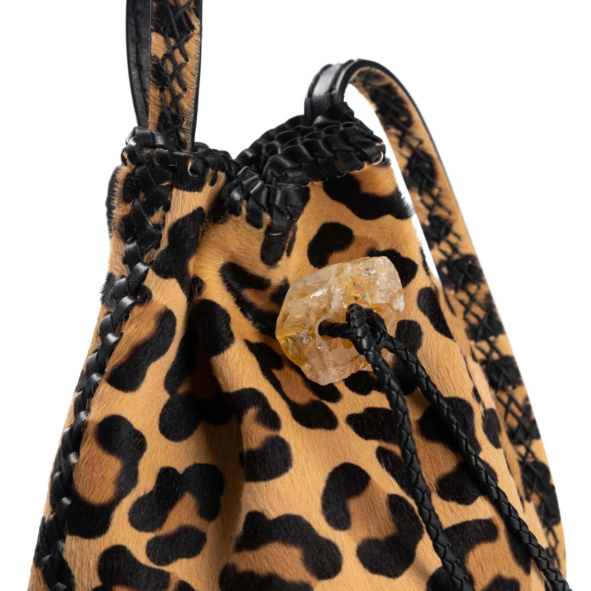 Iacobella Bucket In Leopard Pony Hair Lined In Black Suede With Citrine Stone Enclosure.