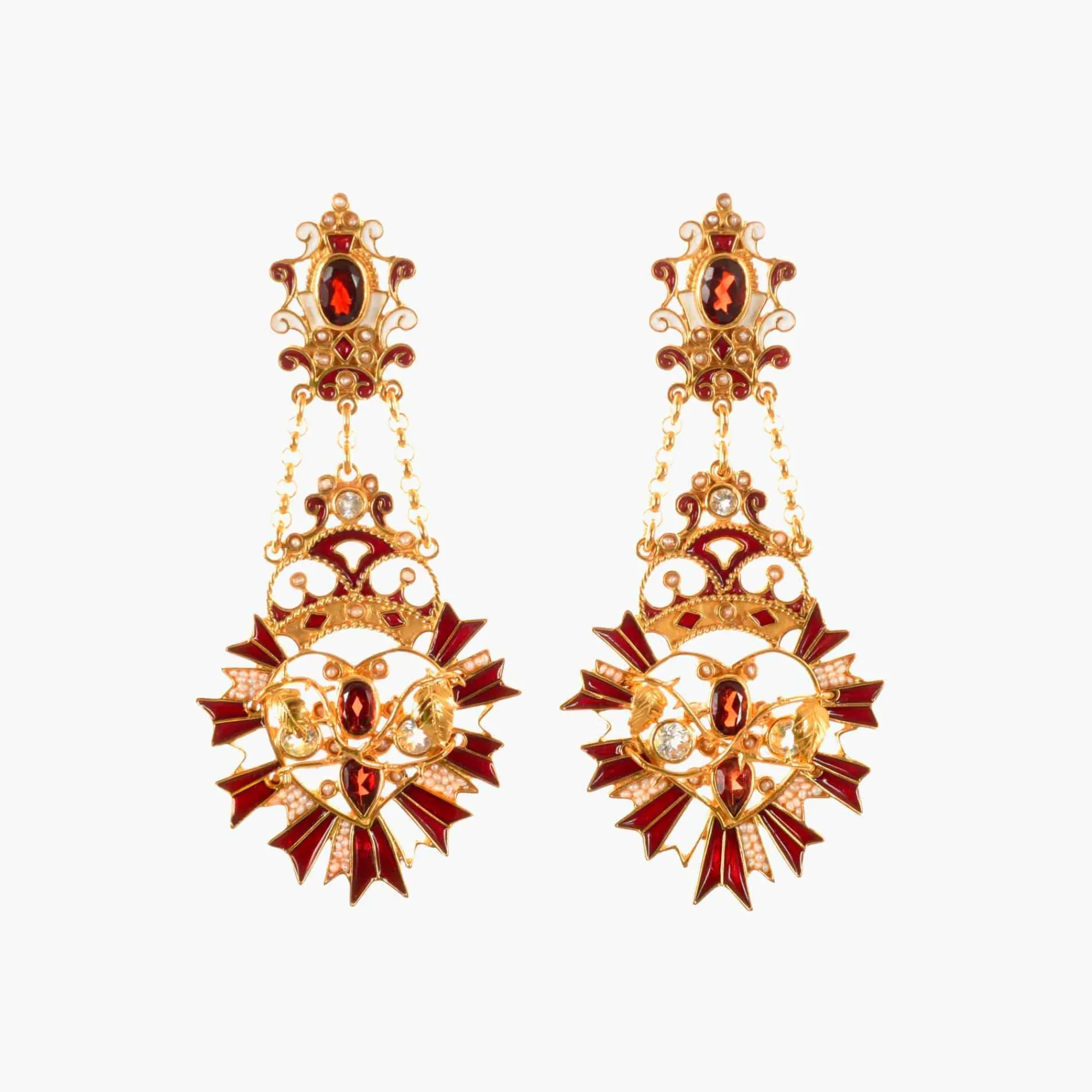 A Cascade Of Garnets, Blue Topazes, Natural Pearls And Cloisonne Enamel Converge Into A Regal Sacred Heart, And Mounted On 24Kt Gold Plated Sterling Silver. Diego Percossi Papi Personally Designs And Meticulously Handcrafts Each Pair In His Rome Atelier So No Two Earrings Are The Same. Throw Your Hair In A Bun To Show Them Off.