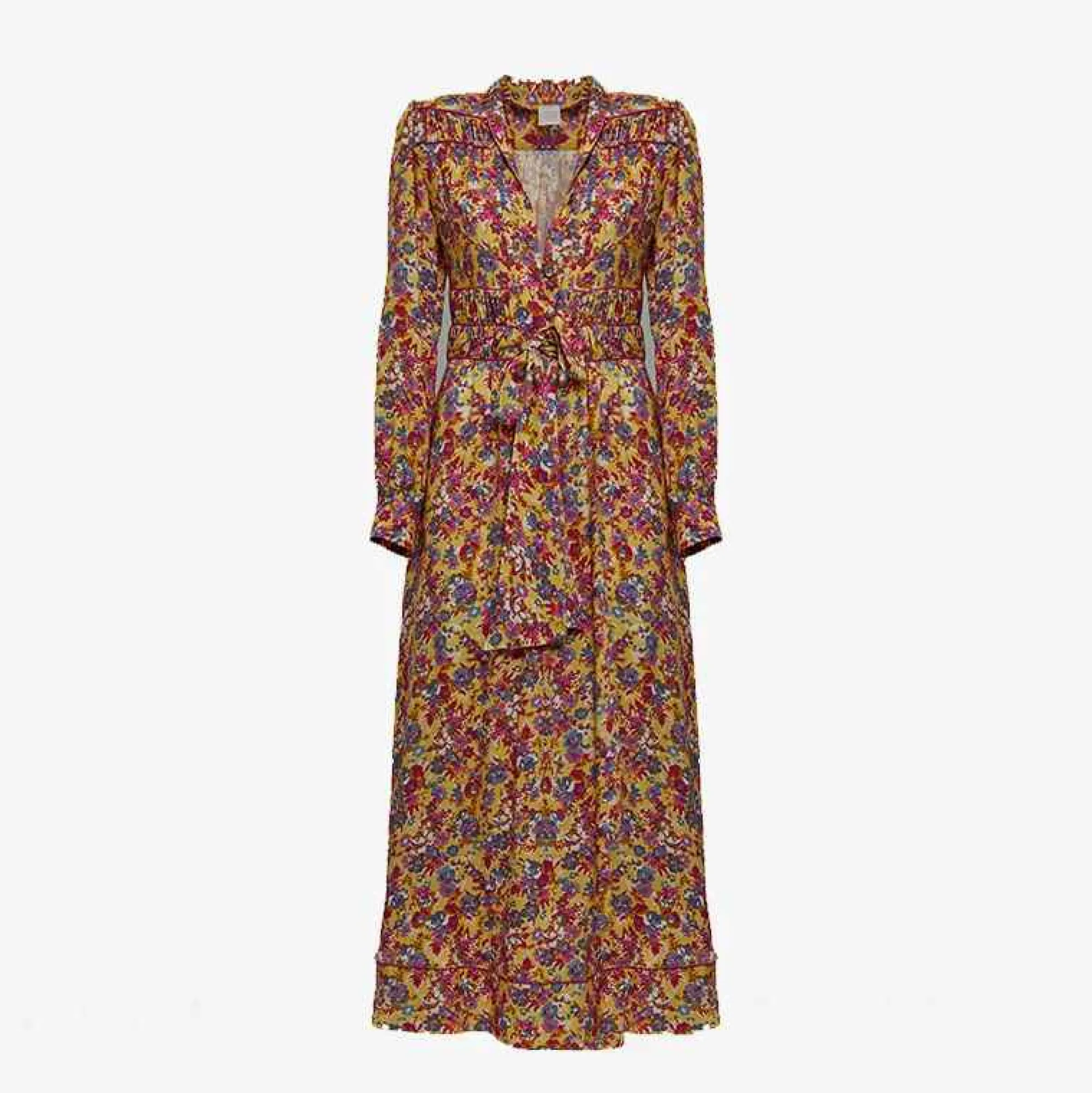 Loretta Caponi Krizia Front Buttoned Long Sleeves Full Lenght Dress With Buyonnet Embroidered Details And Contrast Piping Is Perfect For Every Occasion. Handmaded In Tuscany By Master Artisans.