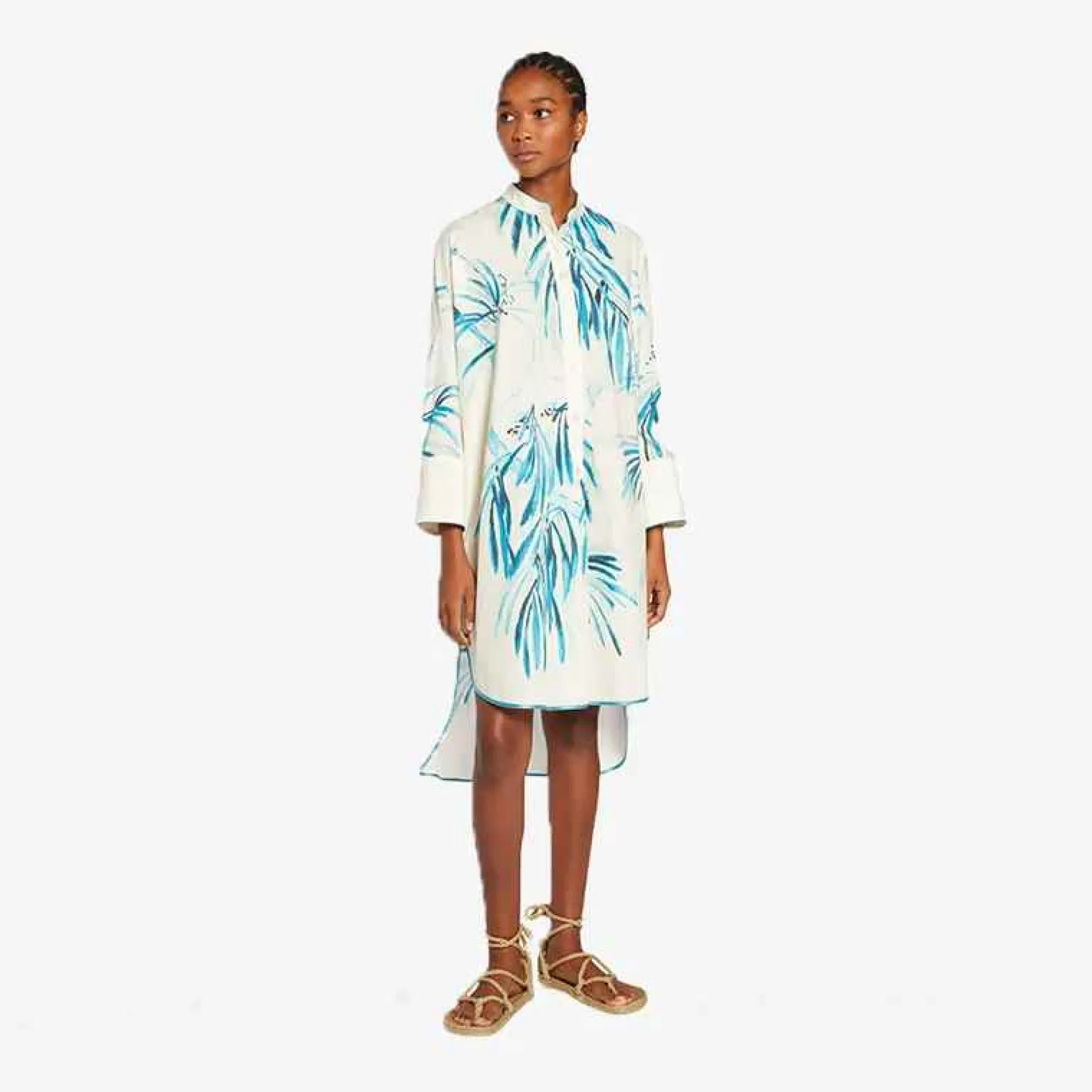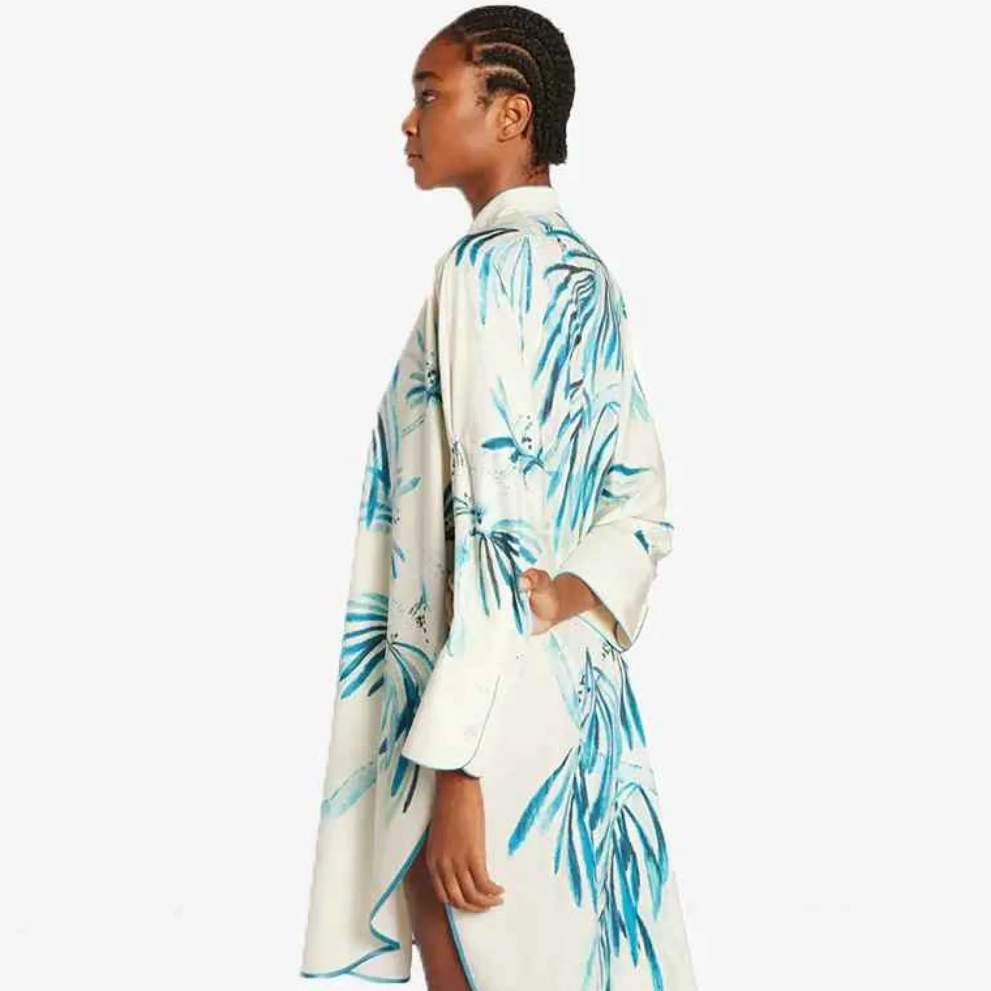 Frs For Restless Sleepers Noto Dress Is Inspired By Indian Traditional Kaftans, The Simple Chic Guru Collar And Oversized Silhouette Is Embraced By The Stunning Turquoise Palm Print. It Can Be Easily Worn Alone Or As A Long Shirt Over Pants For A Statement Look!